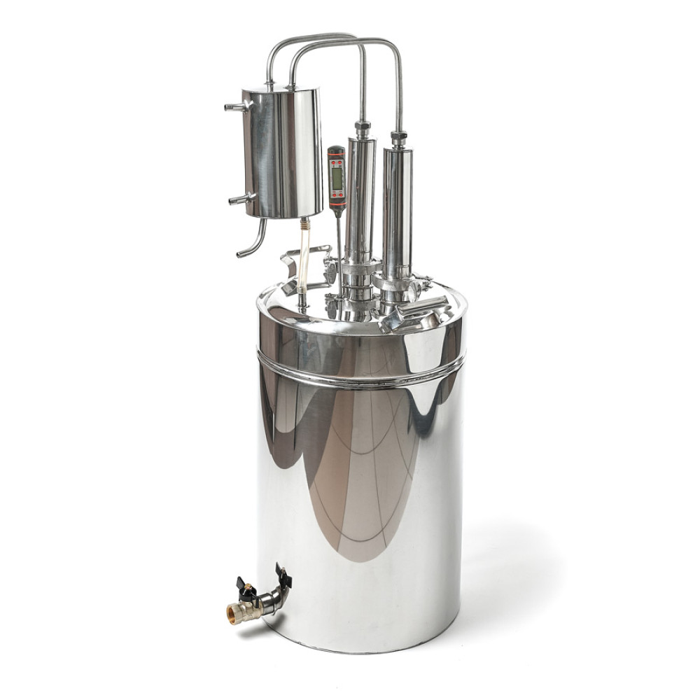 Made from polished stainless steel food machinery ensures a comfortable and safe operation. Factory quality ensures reliable process of double distillation of moonshine, whereby you get the distillate of high purity of contaminants and noxious fumes.
