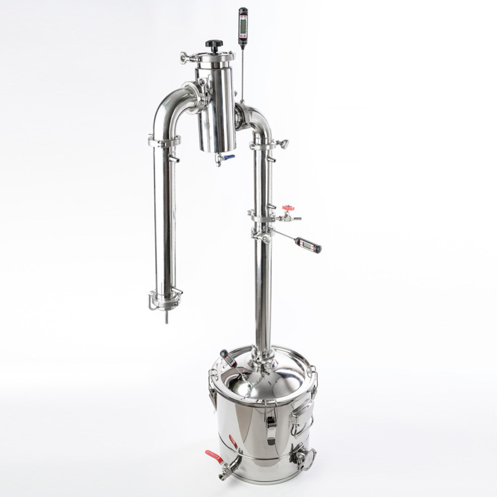 The set is able to cover the needs for any type of alcohol - vodka, moonshine, whiskey, cognac, liqueurs. The stainless steel gin basket makes it easy to flavor the finished drink using gin technology without placing herbs and berries in gauze bags. In addition, an internal groove is made on the distillation cube for quick and easy installation of a false bottom with a diameter of 300 mm to avoid sticking thick aromatic bregs. Technological units are provided for collecting heads and draining the accumulated fusel oils in the gin basket without stopping the working cycle. The cube is equipped with a reliable bimetallic thermometer, and an electronic thermometer in the column allows you to control the operating mode of the mash column.