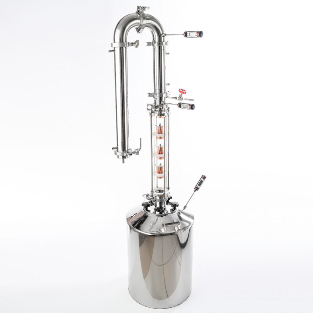 The delivery set includes a 30 l boiling cube, this is the optimal size for working with the equipment without outside help. The cube can be equipped with a safety valve to relieve excess pressure. The diameter of the neck of the cube is 110 mm, which provides a quick cleaning procedure. All components are made of stainless steel (except copper caps), including a reflux condenser and a refrigerator. It is easy to change the configuration of the equipment, all components are made by a modular principle, with quick-release clamp connections.