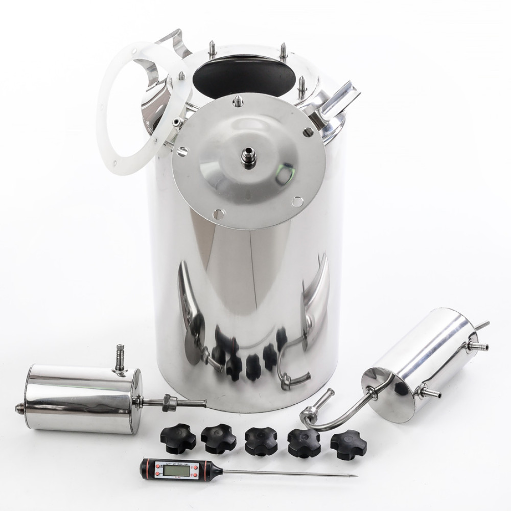 - Fill the distillation cube with a small amount of clean water, collect the brewing apparatus, and connect the hoses to supply water for cooling to boil (distilled) for 30 minutes. To disassemble the moonshine machine, to drain the remaining water from the distillation cube and the dryers.